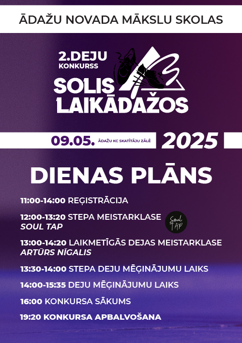 Šī gada, 9.maijā Ādažu Kultūras centrā notika jau otrais Ādažu novada Mākslu skolas rīkotais deju konkurss "Solis laikā Ādažos 2025" – spilgts un iedvesmojošs notikums, kas pulcēja vairāk nekā 300 dejotāju no dažādām Latvijas pilsētām un novadiem.